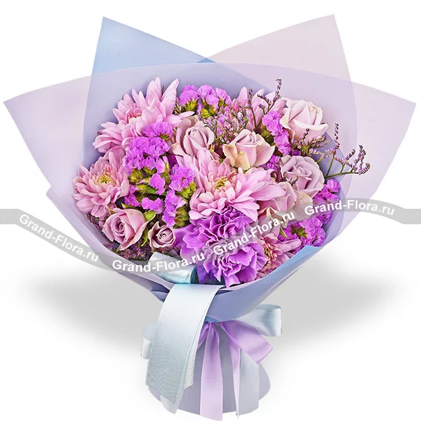 Стандартный: диантус фиолетовый - 3 шт., хризантема кустовая ромашковая фиолетовая - 2 шт., кустовая роза фиолетовая - 2 шт., статица, лимониум, упаковка, лента.